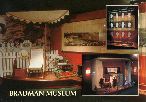 Bradman Museum of Bowral NSW, post card, 105 mm x 150 mm, shows the Bradman Gallery, Memorial single Portrait stamp, commemorative first day of issue postmark 13 March 2001, Bowral NSW 2576, over-printed on reverse in green with score card of Bradman, 9 over-printed, postmarked and numbered. |