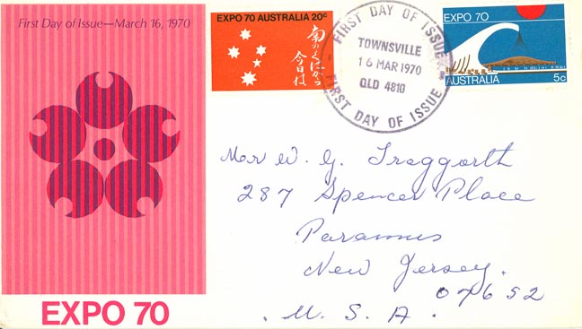 Australia Post Office, first day cover, Size 6 (95 mm x 165 mm), Expo 70 Osaka Japan set, first day of issue circular date stamp 16 March 1970, Townsville Queensland, the FDC that led to the complete demise of the private cachetmakers of Australia, henceforth the Post Office produced specific to issue FDCs for all Australian stamps. |