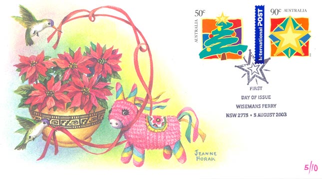 AFDCS (American FDC Society) of Tucson Arizona USA, first day cover, Size 6 (95 mm x 165 mm), Court of Honour No. 23 for Christmas by Jeanne Horak, set of two Peace and Goodwill Greetings stamps of Australia, commemorative first day of issue postmark 5 August 2003, Wisemans Ferry, NSW 2775, 10 numbered with insert. |