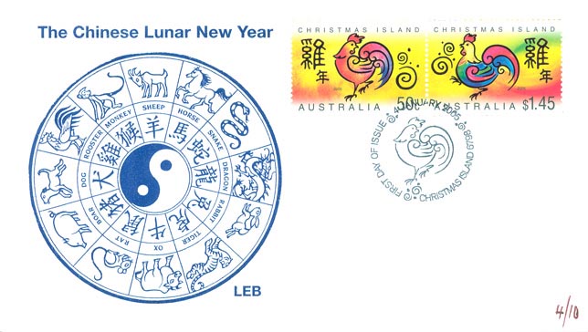 LEB (Lorraine Bailey) of Arlington Virginia USA, first day cover, Size 6 (95 mm x 165 mm), Australia Christmas Island Year of the Rooster, set of two se-tenant stamps from miniature sheet, commemorative first day of issue postmark 4 January 2005, Christmas Island 6798, 10 postmarked and numbered. |