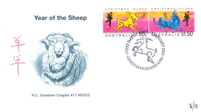 Robert C. Graebner AFDCS Chapter of Springfield Virginia USA, Blue first day cover, Size 6 (95 mm x 165 mm), Australia Christmas Island Year of the Goat, set of two se-tenant stamps from miniature sheet, commemorative first day of issue postmark 7 January 2003, Christmas Island 6798, 10 postmarked and numbered. |