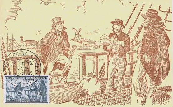 Seven Seas Stamps of Dubbo New South Wales, post card, 90 mm x 140 mm, serviced as a maximum card, 4d stamp for 150 years of the Australian Post Office, circular steel first day of issue postmark 22 April 1959, Clarence Street Sydney NSW, Bill Hornadge of Seven Seas was a pioneer in maxicards of Australia. |