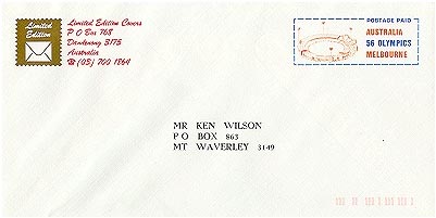 HOME | Olympics | 1956 Melbourne | 1996 Atlanta (bid by Melbourne) | 2000 Sydney | Other Olympics | Cricket | Bradman | 1977 Test Cricket Centenary | 1973 County Cricket Centenary | Cover and Postmarks | Other Sports | Horseracing | Commonwealth Games| Post Office Covers | Limited Edition Covers | Scarce Australian Postmarks| Overseas Mailers | Australian Joint Issue with USA 1988 | Lunar New Year | Christmas | Arthur Bergen | Geerlings | Fleetwood | War and Peace | Owls | Thomas Merton | Contact Us | Ordering |